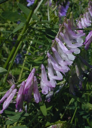 Faunal Associations: The nectar of the flowers attracts bumblebees, butterflies, and skippers (especially the former). The caterpillars of some butterflies and moths feed on the foliage of Vicia spp. (Vetches) and other legumes, including Glaucopsyche lygdamus (Silvery Blue), Colias eurytheme (Orange Sulfur), Caenurgina chloropha (Vetch Looper Moth), and Cnephasia longana (Ominivorous Leaftier). The latter species is a Tortricid moth. The thrip Sericothrips cingulatus has been found on the foliage of Vetches in Illinois. The seeds and foliage of Vetches are eaten to a limited extent by upland gamebirds, including the Ruffed Grouse, Wild Turkey, and Prairie Chicken. The foliage is palatable to livestock and other mammalian herbivores. The seeds of some Vetches, if they are eaten in quantity, may be poisonous to cattle.