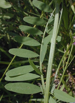 Description: This plant is a winter or spring annual that becomes 1½–3' long. It has a tendency to sprawl in the absence of supportive vegetation. The stems are light green, terete, ridged, and shiny; they often have sparse fine hairs that are very short and appressed in the channels between the ridges. The alternate compound leaves are evenly pinnate with 12-20 leaflets and a pair of terminal tendrils that can cling to adjacent vegetation. Each leaflet is up to 1" long and ¼" across, light to medium green, oblong, and smooth along the margins. Older leaflets are usually hairless, while young leaflets often have a few appressed white hairs that are rather long. The central stalk (or rachis) of each compound leaf is shiny, ridged, and flat-topped; this stalk usually has short appressed hairs like the stems, otherwise it is hairless. At the base of each compound leaf (where the petiole joins the stem), there is a pair of eared stipules with narrow basal lobes. Individual racemes of flowers develop from the axils of the upper compound leaves.
