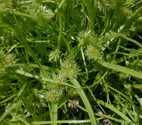 Description: This flatsedge is a summer annual about 2-6" tall. It sends up several culms from the base, otherwise it is unbranched. The culms are up to 4" long, light green, hairless, and usually 3-angled. There are 0-3 alternate leaves along each culm when the flowers bloom (older leaves become brown and withered). The leaf blades are up to 3½" long and 3 mm. across; they are light green, glabrous, linear, and shallowly furrowed along their central veins. Each culm terminates in 1-3 sessile (or nearly sessile) heads of spikelets; less often, heads of spikelets may be produced on short stalks (rays) up to ½" long. Each head consists of several ascending to spreading spikelets. Each spikelet is about ¼" (6 mm.) long and flattened, consisting of 6-10 flowers and their scales in two columnar ranks.