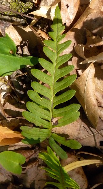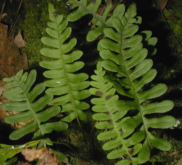 Comments: The evergreen leaves of this fern are quite attractive. Common Polypody (Polypodium virginianum) can be distinguished from other ferns by its pinnatifid leaves with oblong lobes and its round sori without indusia (spore-bearing structures that lack protective membranes). Another fern species in the Polypody family, Gray Polypody or the Resurrection Fern (Pleopeltis polypodioides), is found in southern Illinois. Unlike Common Polypody, this latter fern has scaly leaf undersides. Furthermore, its pinnatifid leaves have sinuses that are concave, rather than acute. This latter fern is occasionally epiphytic (grows in trees), and it is able to withstand considerable desiccation of its leaves. Sometimes Common Polypody is considered a variety of the European species, Polypodium vulgare. Another common name of Polypodium virginianum is the Rockcap Fern.