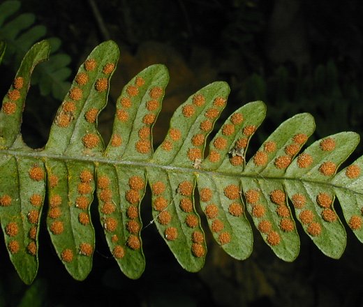 The petioles are typically about one-fourth to one-half of the length of the leaf blades; they are light green, glabrous to sparsely scaly, and jointed toward their bases. The rachises of the leaf blades are similar to the petioles; they are typically glabrous above and more scaly below. The sori (or spore-bearing structures) are located on the underside of some leaf blades. There are about 2-12 pairs of small sori on either side of the central vein of each lobe; the sori are located about half-way between the central vein and each margin, or they are located closer to the margins. Only the upper to middle lobes have sori. The sori are round in shape, becoming orange-brown to brown and hairy-looking when they are mature. Unlike many other species of ferns, the sori of Common Polypody lack indusia (protective membranes). The spores are released during the autumn. The root system consists of long scaly rhizomes and fibrous roots; these rhizomes branch occasionally. Clonal colonies of leaves are produced from the rhizomes at favorable sites.